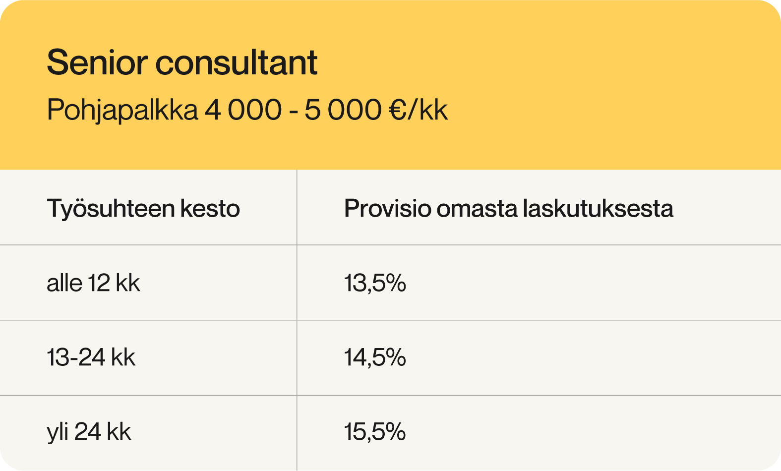 Reilu ja läpinäkyvä palkkamallimme koostuu peruspalkasta ja omiin laskutettaviin tunteihin perustuvasta provisio-osuudesta. Kokeneimpien ohjelmistokehittäjien peruspalkka on 5000 €/kk. Omaan laskutukseen perustuva provisio-osuus on ensimmäisen työvuoden ajan 13.5%, toisen työvuoden 14.5% ja kolmannen työvuoden alusta 15.5%.